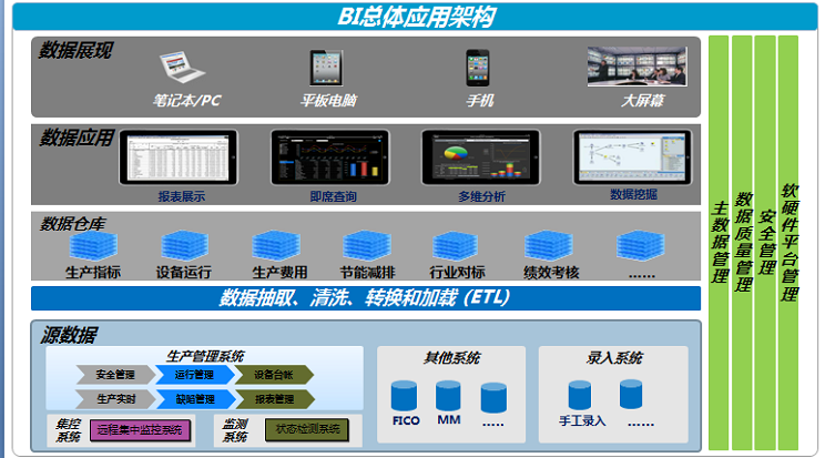 基于數據倉庫理念和思想,對公司不同應用系統的數據進行整合,實現新能源公司總部及各分、子公司的核心業務數據集中、集成與優化整合,統一指標口徑,建立新能源電力公司的數據中心,從而消除信息孤島,實現所有業務數據的統一管理。