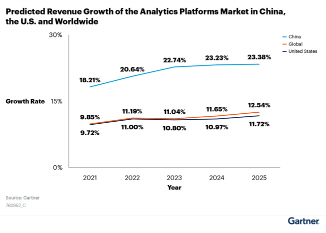 此次發布的《中國分析平臺市場指南》中,Gartner從市場趨勢、競爭格局、產品方向等多個維度對中國的數據分析市場做了分析和預測。