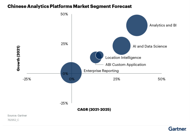 在《指南》中,Gartner對數據分析平臺的能力做了進一步的定義,包括了:企業報告平臺、ABI平臺、AI和數據科學平臺、ABI定制化應用和位置智能平臺等方向。而在這些細分市場中,增長最快的領域是ABI平臺、AI和數據科學平臺,預計復合年增長率分別為36.23%和27.72%。