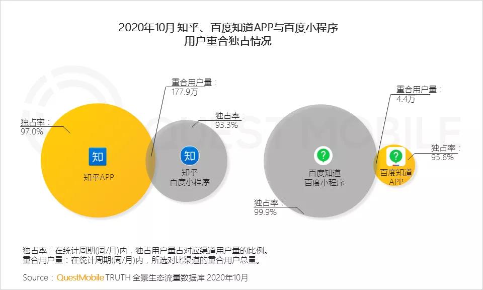 除了同一個(gè)app獨(dú)占率自己的對(duì)比, 同種類型的app的獨(dú)占率還做了對(duì)比. 比如百度知道app 獨(dú)占率 95.6%, 宣布內(nèi)附知乎app 獨(dú)占率(97.0%)略低。但百度小程序的獨(dú)占率(99.0%)要大大高于 知乎小程序的獨(dú)占率 93.3%。