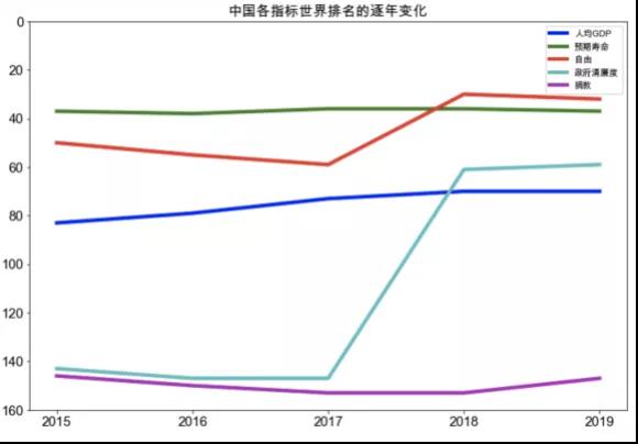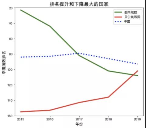 由可以看出,在所有國(guó)家中,幸福指數(shù)排名上升最快的國(guó)家是貝寧共和國(guó),2015年到2019年間,從155升至102。而下降最快的是委內(nèi)瑞拉,世界排名從23驟降到108。中國(guó)的變化較為平穩(wěn),一直處于80~90名左右。經(jīng)過(guò)查閱相關(guān)資料可發(fā)現(xiàn),近年來(lái)委內(nèi)瑞拉經(jīng)濟(jì)崩潰,通貨膨脹嚴(yán)重,民不聊生,食不果腹,因此其幸福指數(shù)必然暴跌。