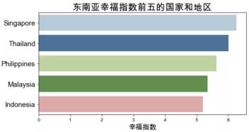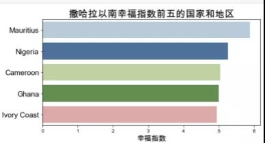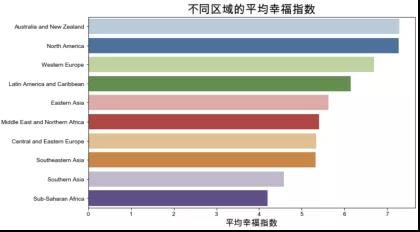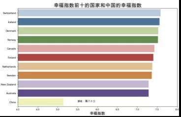 基于2015年的數(shù)據(jù)。將各區(qū)域的國(guó)家的幸福指數(shù)加總并計(jì)算平均值后,得到各區(qū)域的平均幸福指數(shù)。澳大利亞和新西蘭、西歐以及北美的平均幸福指數(shù)最高,幸福指數(shù)最低的三個(gè)區(qū)域是東南亞、南亞和撒哈拉以南的非洲地區(qū),對(duì)比中國(guó)與幸福指數(shù)前十的國(guó)家,可以看到中國(guó)的幸福指數(shù)排名為世界中游水平。