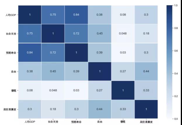 東南亞各國(guó)除了新加坡外的幸福指數(shù)排名處于世界中游。雖然并不理想,但相比于中國(guó)還是略高的。新加坡、泰國(guó)、菲律賓、馬來(lái)西亞、印度尼西亞的世界排名分別為:34,52,69,80,92。 中、東歐的總體水平雖然不如其近鄰西歐,但是依然處于世界前列。這份報(bào)告中東歐包含了部分中亞國(guó)家的成員國(guó),這里所謂的東歐指實(shí)際上的中亞部分國(guó)家。車(chē)臣、斯洛伐克、波蘭、烏茲別克斯坦、立陶宛的世界排名分別是:20,38,40,41,42。 國(guó)外的報(bào)告熱衷于將臺(tái)灣和香港單列出來(lái),這份報(bào)告也不例外。東亞國(guó)家和地區(qū)屈指可數(shù),而我國(guó)卻不能居前五,只能說(shuō)明我們?nèi)孕枧ΑE_(tái)灣、韓國(guó)、日本、香港和蒙古的全球排名分別為:25,54,56,78,83。 南亞諸國(guó)一直以來(lái)都是第三世界國(guó)家,其幸福指數(shù)也確實(shí)不夠理想。巴基斯坦、不丹、尼泊爾、孟加拉國(guó)、斯里蘭卡的全球排名分別是:67,95,100,125,130。 撒哈拉以南的非洲各國(guó)經(jīng)濟(jì)落后,社會(huì)發(fā)展程度不高。毛里求斯、尼日利亞、喀麥隆、加納、科特迪瓦全球排名為:57,85,96,98,99。 我們發(fā)現(xiàn)幸福指數(shù)很高的這些國(guó)家都為發(fā)達(dá)國(guó)家,有可能是因?yàn)檫@些國(guó)家的人口基數(shù)少,發(fā)展精工業(yè),社會(huì)制度以及良好的醫(yī)療保障等等因素。而一些發(fā)展中國(guó)家,例如中國(guó),印度等國(guó)家處于中游水平,而幸福指數(shù)最低的幾個(gè)國(guó)家大部分都集中在非洲地區(qū),可能是因?yàn)椋侵薜貐^(qū)的經(jīng)濟(jì)效益不好,戰(zhàn)亂等因素導(dǎo)致的。下面我們研究各個(gè)指標(biāo)對(duì)幸福指數(shù)的影響,看看什么指標(biāo)對(duì)幸福指數(shù)是影響最大的,換句話說(shuō),什么能使人民感到幸福? 我們對(duì)合成幸福指數(shù)所用到的分?jǐn)?shù)進(jìn)行相關(guān)系數(shù)的計(jì)算可以發(fā)現(xiàn),人均GDP與社會(huì)支持和預(yù)期壽命之間具有高相關(guān),相應(yīng)的社會(huì)支持和預(yù)期壽命也存在高相關(guān)。自由與其他因素只有中等程度的相關(guān),而慷慨(捐款)、政府清廉度與其他因素的相關(guān)度都不高。 上述的結(jié)果表明,經(jīng)濟(jì)可能對(duì)預(yù)期壽命和社會(huì)支持都有很強(qiáng)的影響,自由在一定程度上會(huì)影響其他因素,而捐款和政府的清廉程度與其他因素的關(guān)系并不明顯。 由此可推論,發(fā)展經(jīng)濟(jì)是促進(jìn)幸福的硬道理,無(wú)論是預(yù)期壽命還是社會(huì)支持都要有經(jīng)濟(jì)基礎(chǔ)。政府要保持一定程度的清廉才能有利于其他方面的發(fā)展,保證人們的自由也是為幸福提供保障,為其他方面得以發(fā)展的必備條件。 04 中國(guó)幸福指數(shù)分析 我們將中國(guó)在各指標(biāo)上的得分與該指標(biāo)上得分最高的十個(gè)國(guó)家進(jìn)行對(duì)比,分析中國(guó)排名落后的原因。對(duì)人均GDP的分析可以發(fā)現(xiàn),中國(guó)的人均GDP排名全世界第70位,據(jù)此來(lái)看,中國(guó)在發(fā)展中國(guó)家的地位是穩(wěn)穩(wěn)當(dāng)當(dāng)。 我國(guó)的社會(huì)支持在世界排名中為108名。有人說(shuō)如今的中國(guó)社會(huì)人情淡漠,缺乏人與人之間缺乏互助精神,這可能是由于我國(guó)人口眾多,資源有限,競(jìng)爭(zhēng)激烈造成的。人們都在忙于為自己的生活奔波,沒(méi)有時(shí)間去顧及別人。一帶一路在世界范圍內(nèi)交朋友,我們是不是該先想想,怎么和身邊的人交朋友呢? 我國(guó)的預(yù)期壽命排名世界第37,可以說(shuō)是很了不起的成績(jī)了。試想發(fā)展中國(guó)家這么多,我們卻能在預(yù)期壽命上處于世界前列。說(shuō)明我國(guó)在醫(yī)療領(lǐng)域和民生領(lǐng)域的建設(shè)上發(fā)展迅速。 我國(guó)的自由指標(biāo)的世界排名為32,可以說(shuō)即使我們有看不見(jiàn)的墻,有諸多言論方面的管控,可是我們已經(jīng)享有了很高程度的自由。自由對(duì)營(yíng)商的重要性不必多言,市場(chǎng)經(jīng)濟(jì)能高效運(yùn)轉(zhuǎn),自由是前提。 我國(guó)的捐款指標(biāo)的世界排名僅為147,這一點(diǎn)可能是拖累我國(guó)幸福指數(shù)的最大原因。我們的公益事業(yè)發(fā)展?fàn)顩r很不好,沒(méi)有形成規(guī)模較大且靠譜的公益組織,相關(guān)的人才隊(duì)伍也沒(méi)建設(shè)起來(lái),民眾的捐款意識(shí)也不強(qiáng)。可能的原因或許是政府包辦了許多工作,更可能與我國(guó)沒(méi)有做公益的文化有關(guān)。希望未來(lái)這一情況得以改善,讓社會(huì)充滿愛(ài)。 我國(guó)的政府清廉度排名為59,這說(shuō)明近幾年中央主持的反腐工作還是比較到位的,同時(shí)也說(shuō)明,我國(guó)過(guò)去的腐敗情況確實(shí)堪憂。 對(duì)過(guò)去五年的中國(guó)在各指數(shù)上的全球排名的變化可以發(fā)現(xiàn),預(yù)期壽命基本保持不變,人均GDP緩步上升,政府清廉度急速上升,捐款狀況在低位徘徊,人民自由先降后升。可以反映出,我國(guó)的反腐斗爭(zhēng)成績(jī)喜人,經(jīng)濟(jì)建設(shè)還需努力,民生醫(yī)療建設(shè)成果要繼續(xù)保持,為了更好的發(fā)展,我們需要更高質(zhì)量的自由。