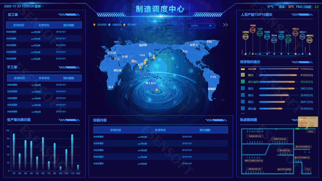 —TOP 4— 制度調(diào)度大屏 最佳分辨率:1920*1080 使用場景:工業(yè)4.0時代,制造業(yè)也開始積極響應(yīng)產(chǎn)業(yè)數(shù)字化的號召,融合大數(shù)據(jù)分析、3D地圖等技術(shù),構(gòu)建體系先進、功能強大、場景豐富的制造調(diào)度指揮系統(tǒng),滿足了生產(chǎn)調(diào)度、應(yīng)急指揮、遠程指揮、綜合決策以及企業(yè)宣傳等多種應(yīng)用場合。 展現(xiàn)邏輯:通過世界地圖一覽在建及歷史項目的運轉(zhuǎn)狀態(tài),方便售后維護;另外對于制造中心內(nèi)的總工單、子工單、物料消耗、人員產(chǎn)能等指標進行充分直觀地展現(xiàn)。