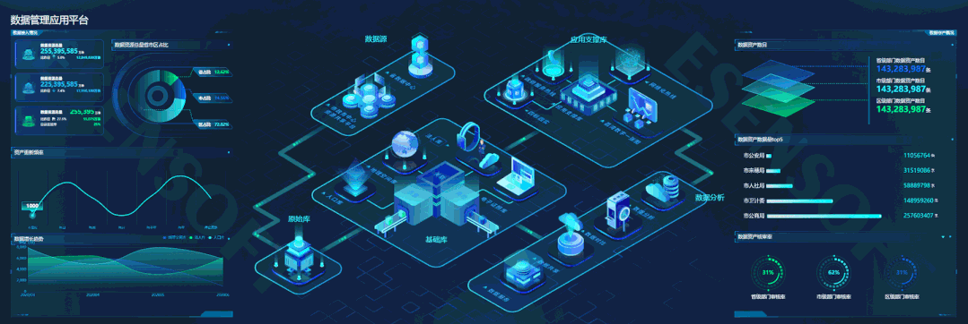 展現(xiàn)邏輯:中心以動畫效果展示數(shù)據(jù)管理應(yīng)用的整個流程,實時展示數(shù)據(jù)接入情況、數(shù)據(jù)增長趨勢、數(shù)據(jù)資產(chǎn)概況等信息。