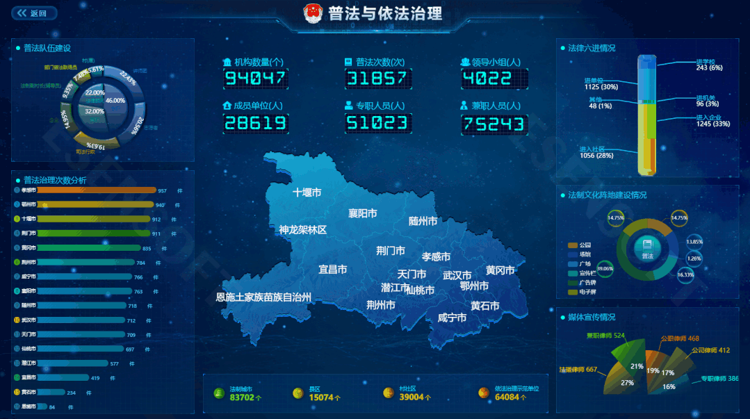 —TOP 2— 法制宣傳大屏 最佳分辨率:1920*1080 使用場景:了解普法工作的推進情況,包括隊伍建設(shè)、媒體宣傳、各個縣市的大數(shù)據(jù)對比等,對于有法制宣傳,法律服務(wù)等需求的行業(yè)提供大屏承載方案,助其成為暢通社情民意、服務(wù)保障民生的監(jiān)管新陣地。 展現(xiàn)邏輯:使用樣式各異的圖表,展示法律行業(yè)內(nèi)的不同需求的數(shù)據(jù),根據(jù)地理位置等信息數(shù)據(jù),直觀、便捷的展現(xiàn)數(shù)據(jù)結(jié)果,讓人一目了然。
