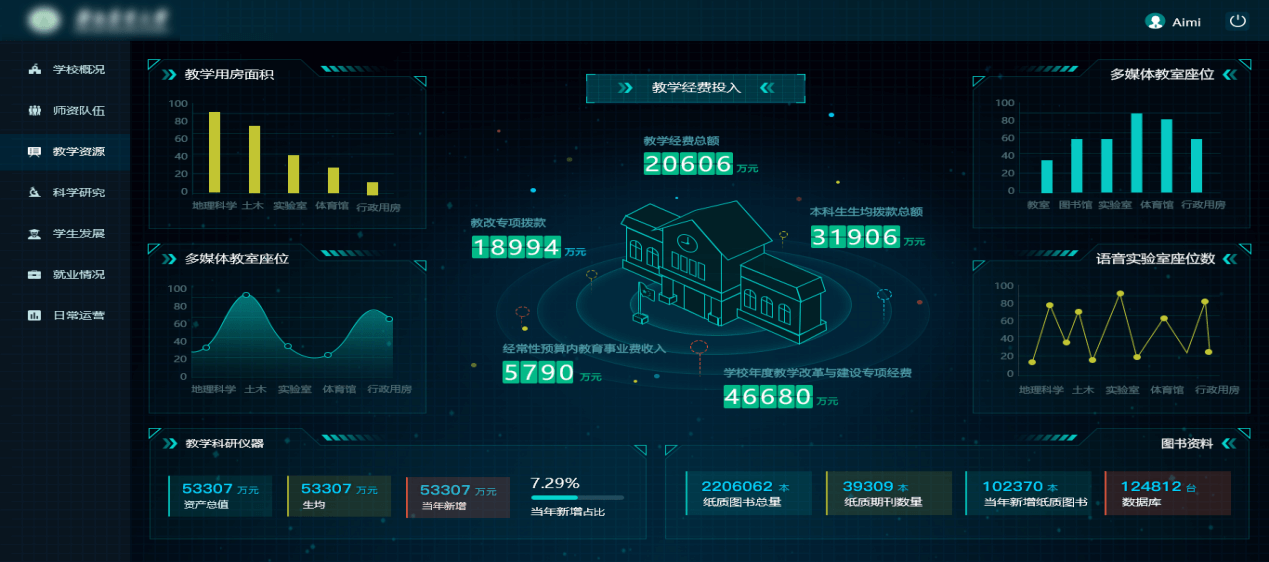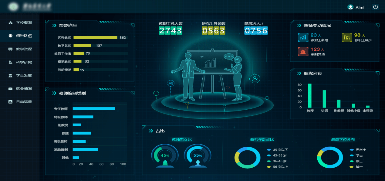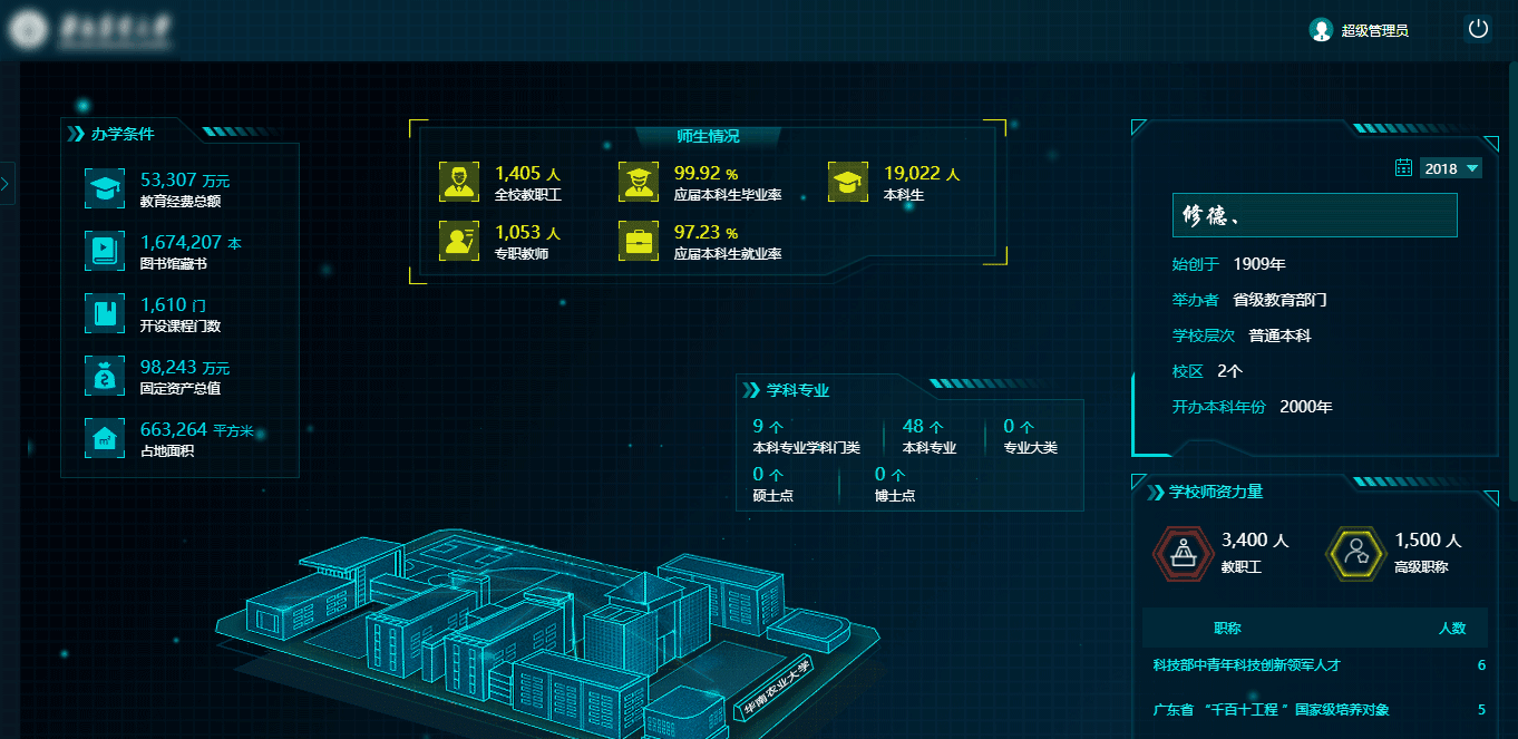 為了展現(xiàn)學(xué)校的實(shí)力,分別從學(xué)校概況、師資隊(duì)伍、教學(xué)資源、科學(xué)研究、學(xué)生發(fā)展、就業(yè)情況和日常運(yùn)營(yíng)的角度來(lái)展示。學(xué)校概況包括辦學(xué)條件、師生情況、學(xué)科專業(yè)和師資力量,再通過(guò)榮譽(yù)稱號(hào)、教師編制類別、教職工人數(shù)、研究生導(dǎo)師數(shù)、高層次人才、職稱分布、最高學(xué)位分布等展示師資隊(duì)伍,用教學(xué)用房面積、教學(xué)經(jīng)費(fèi)投入、教學(xué)科研儀器、圖書(shū)資料等來(lái)表現(xiàn)教學(xué)資源,用著作成果、獲獎(jiǎng)成果、論文與專利等展現(xiàn)科學(xué)研究。