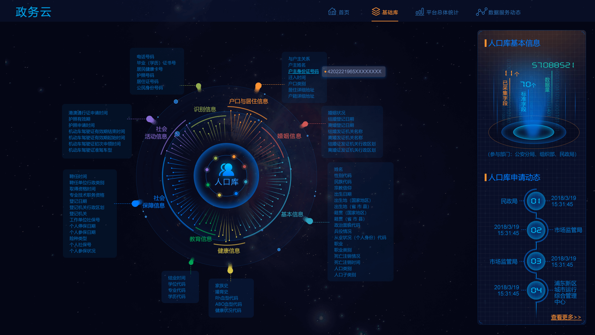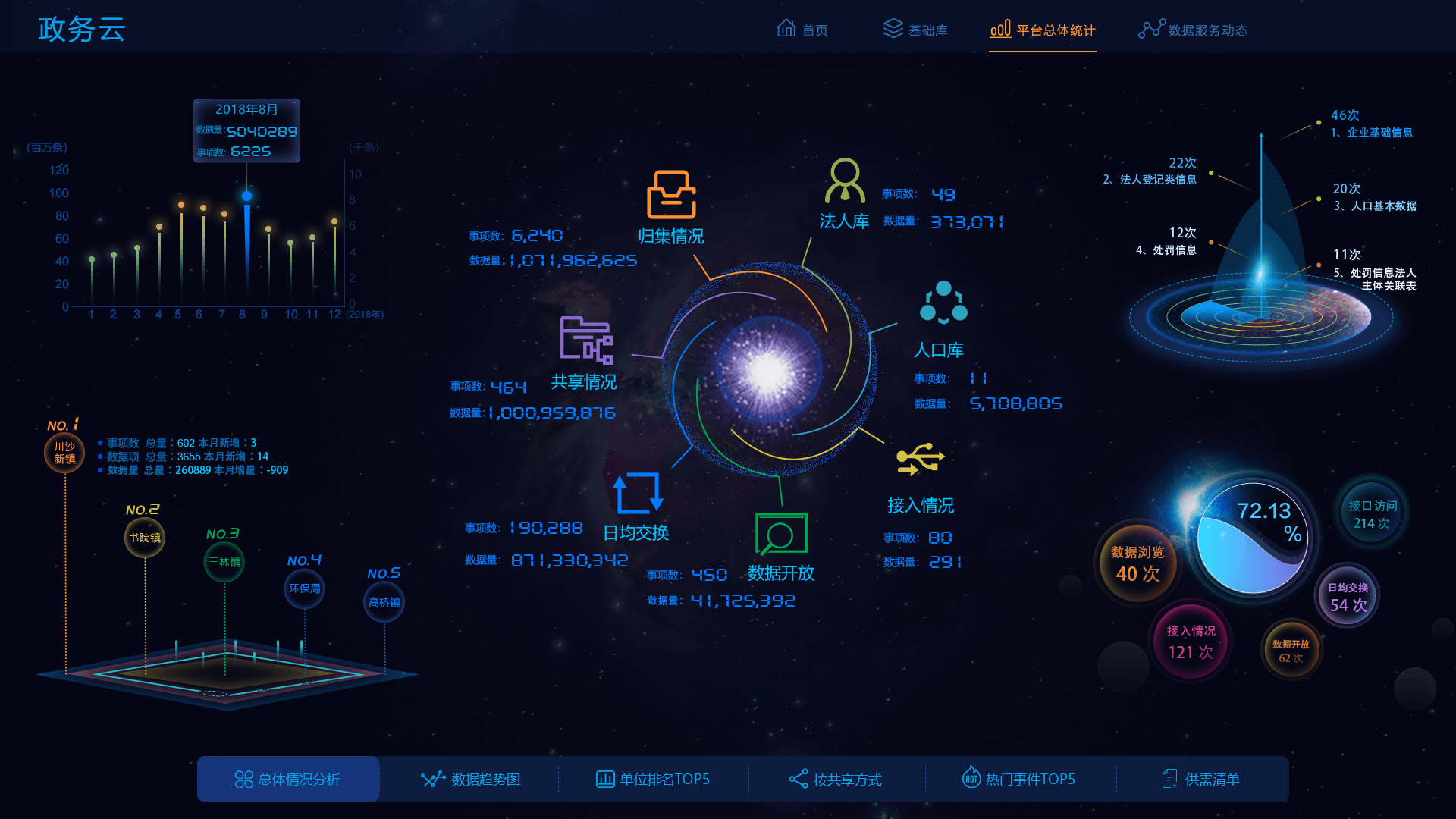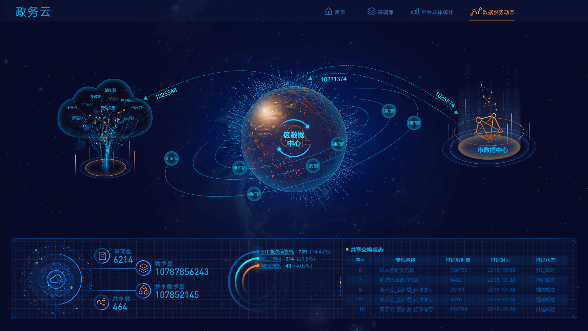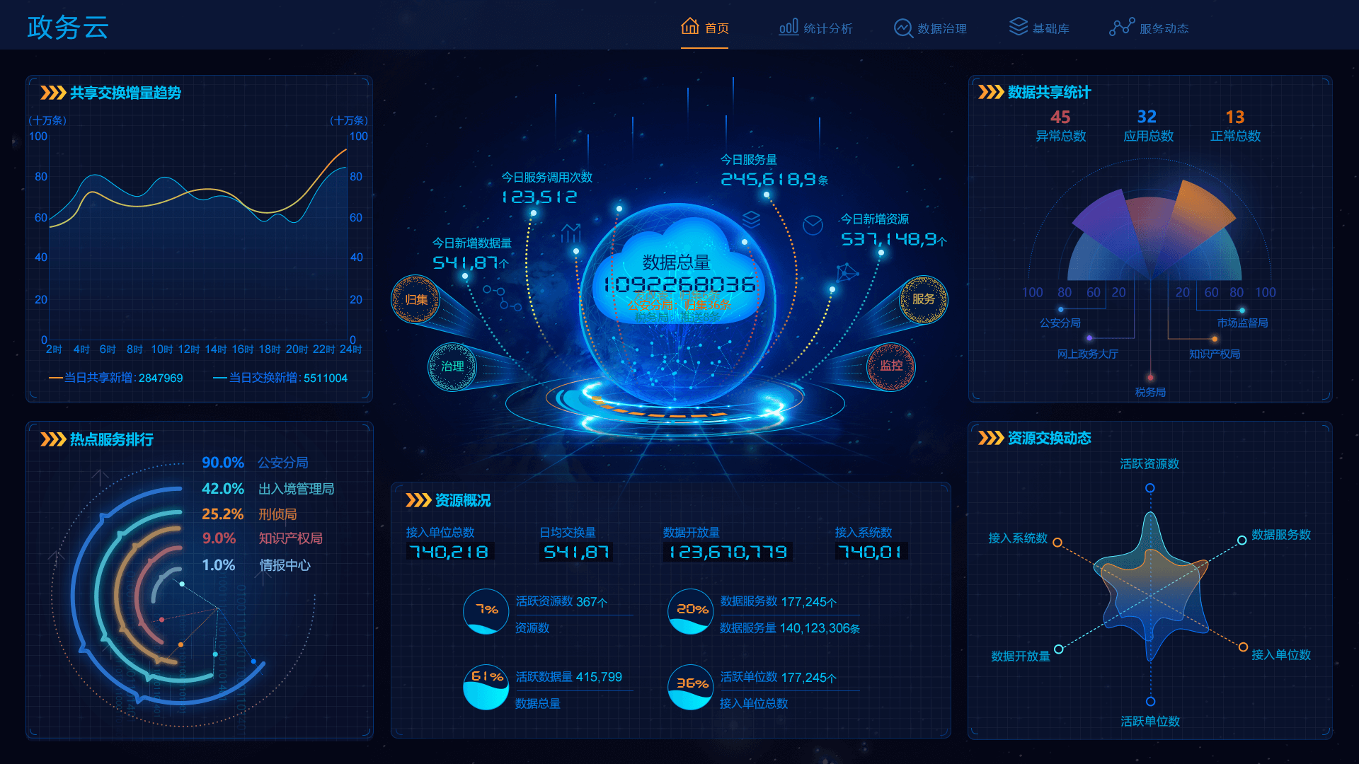 首頁(yè)展示共享方式占比、共享屬性占比、數(shù)據(jù)趨勢(shì)、熱門(mén)事項(xiàng)、和單位排名等,基礎(chǔ)庫(kù)包括人口庫(kù)、法人庫(kù),支持搜索刷新,同時(shí)展示庫(kù)的基本信息和申請(qǐng)動(dòng)態(tài),平臺(tái)總體統(tǒng)計(jì)展示平臺(tái)各類指標(biāo)數(shù)據(jù)的訪問(wèn)、更新情況,數(shù)據(jù)服務(wù)動(dòng)態(tài)展現(xiàn)區(qū)數(shù)據(jù)中心和市數(shù)據(jù)中心等的數(shù)據(jù)實(shí)時(shí)交互狀況,實(shí)現(xiàn)數(shù)據(jù)全方位全時(shí)段把控。